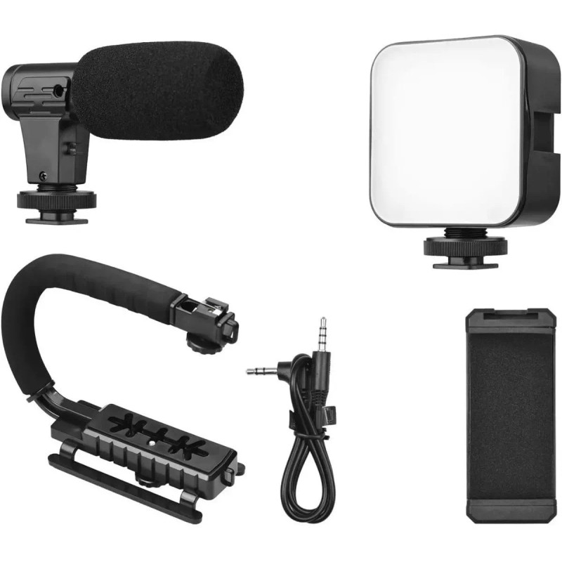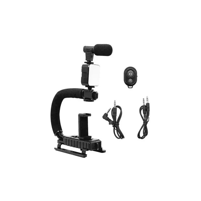 - Este kit portátil incluye un soporte de mano con forma de U/C, una mini luz LED, un micrófono, un soporte para teléfono y un control remoto; perfecto para blogs, podcast, transmisiones en vivo, Youtube, clases virtuales y más.