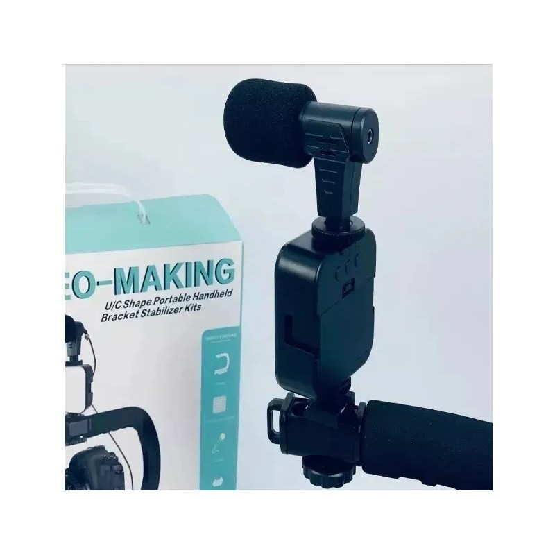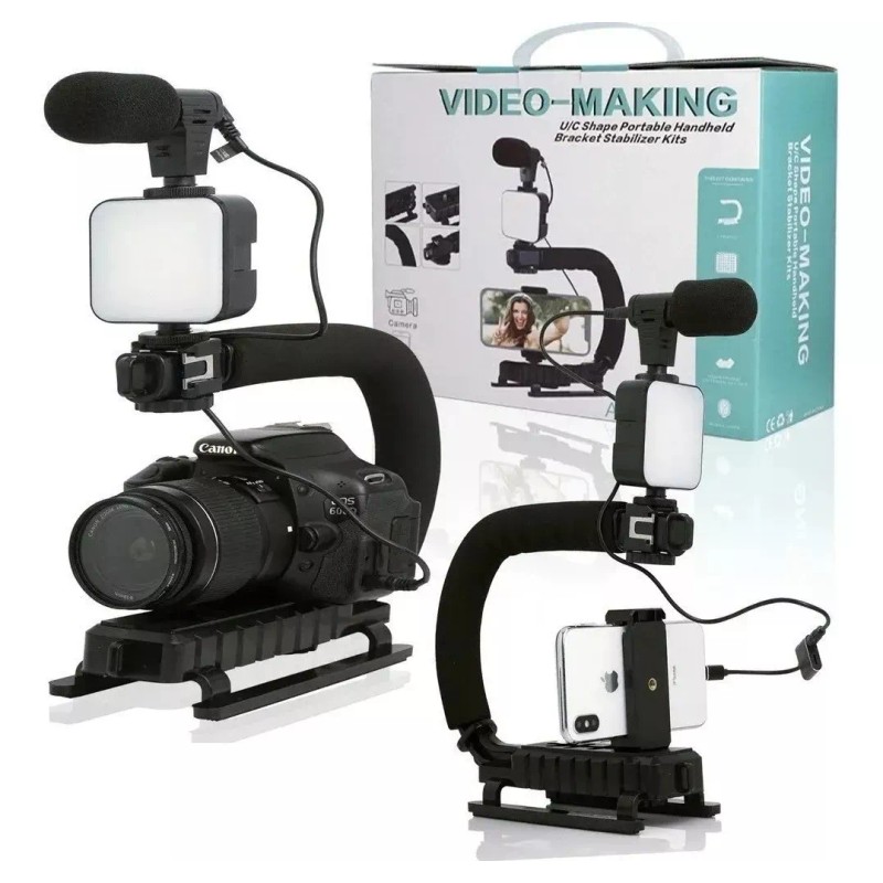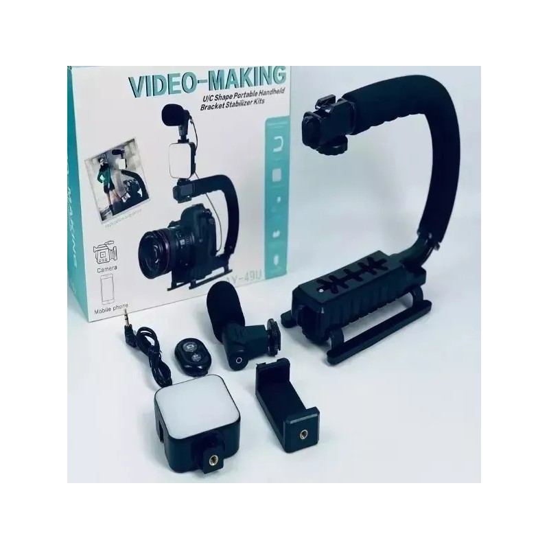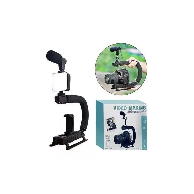 - El kit para creación y transmisión de videos con micrófono para videocámara GTI modelo AY-49U es un kit estabilizador con soporte de mano portátil en forma de U/C.