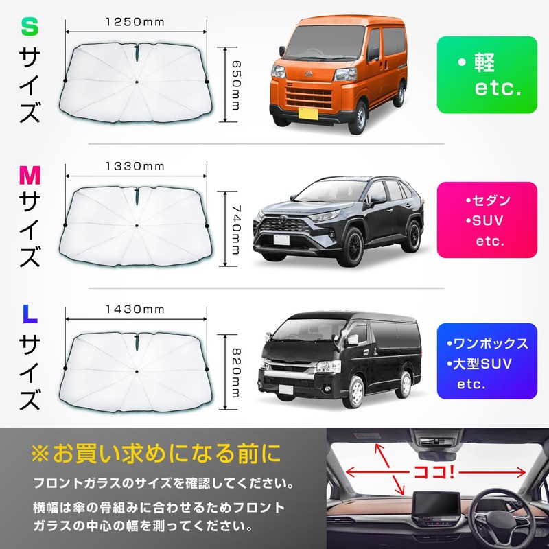 - An umbrella sunshade that can be easily opened with a single touch, put it on, and clip it. The umbrella is shaft-less, so it greatly increases the compatibility of your vehicle. It is also compatible with cars with large monitors on the dashboard. It can be installed without interfering with sensors such as drive recorders and sights