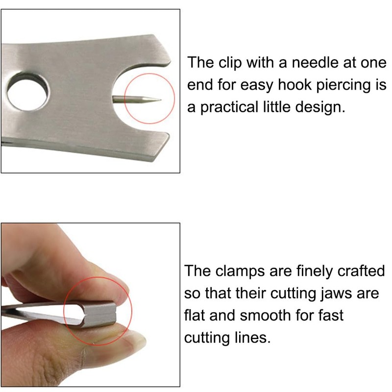 - 【Hook Cleaner】Fishing line cutter tool has a sharp needle that can be used to clean hooks, such as weeds or rust on the hook holes; can be used to fluff and crimp the feathers of fly fishing lures for a more realistic look; also can be used to tidy up messy lines when tying a fishing line knots or hook, making it a practical gadget.