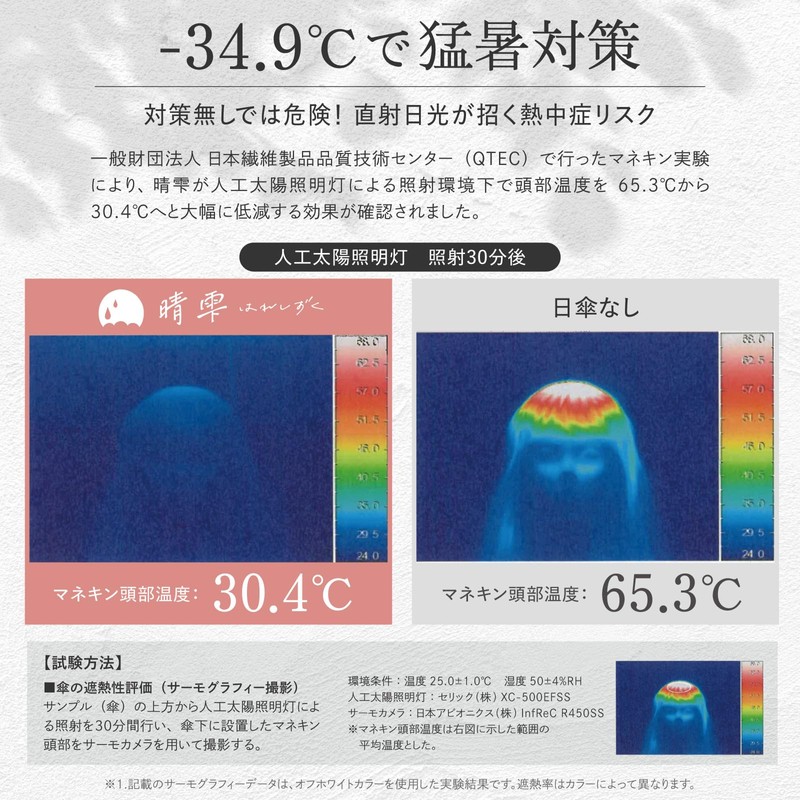 - ▶▶▶▶ Resistant to the sun! (100% Blackout & 100% UV Protection) The fabric used for this product has been certified to 100% UV rays, 100% blackout rate, and UPF 50+ certified by the Japan Material Quality Technology Center (QTEC). In addition, the black coating on the inside prevents glare from the ground or wall. Heat Shielding Rate 56%: Provides excellent heat insulation. Provides comfortable protection against sunlight, extreme heat, and heatstroke. The listed UV protection, light shielding rate, UPF values, and heat shielding rate are measured in the state of the fabric