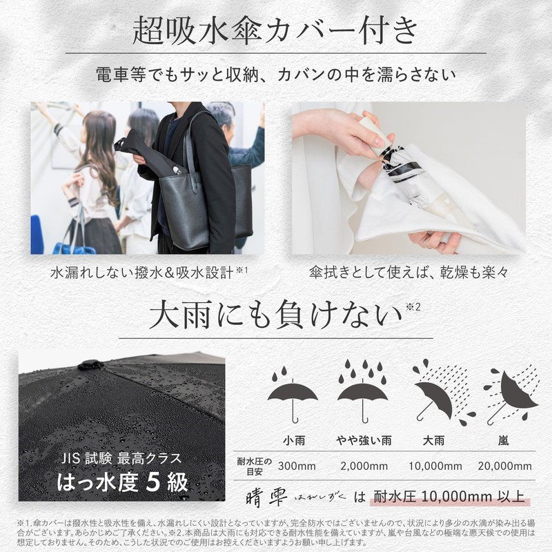 - ▶▶▶ Resistant to rain and rain. (Includes a super absorbent umbrella cover) Can be easily stored on trains and buses. The microfiber inside absorbs water and has a water repellent finish on the outside to keep your bag secure. You can also use it as an umbrella cloth when you open the zipper all the way. It comes with an umbrella case that has the same performance as the super absorbent umbrella cover sold individually. Water Repellent Level 5: Made with fabric that meets the highest standards of JIS standards. With a water pressure resistance of over 10,000 mm, it can be firmly protected even in strong rain. The umbrella cover is designed to be water-repellent and water-absorbent, and leak resistant, but there may be some water droplets in some cases depending on the situation. Please be aware of