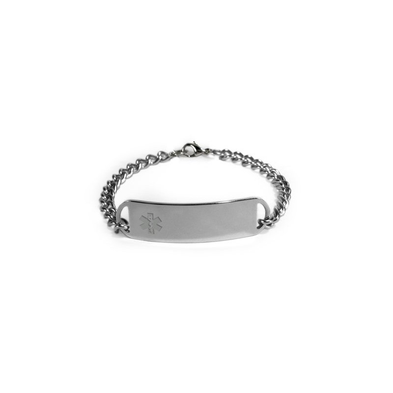 The Medical Id Tag features a CLEAR medical logo embossed on the left side of the plate to allow engraving of medical condition on the front. The bracelet tag is slightly curved for wrist wear.