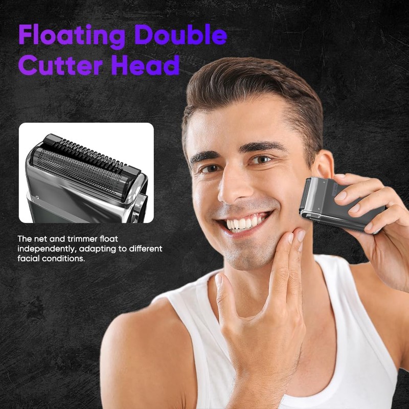 - 【Toothed & Mesh Blades】 - Adaptive, Comfortable Shave Experience a massage-like grooming session with our mens foil shaver. The dual floating heads – independently moving both the mesh guard and trimmer – deliver a straight-line shave without repetitive friction, adapting flawlessly to diverse facial contours.