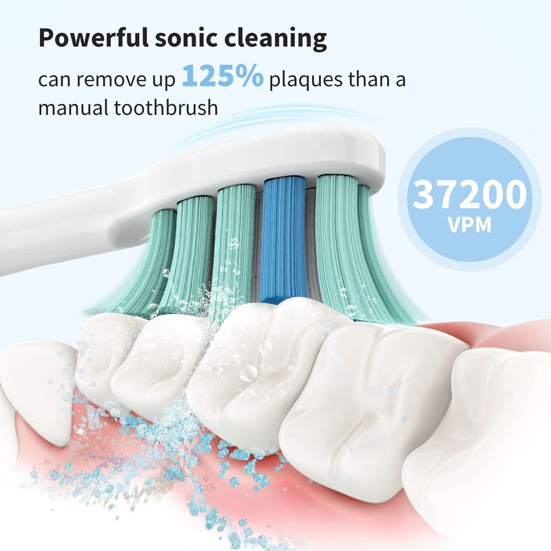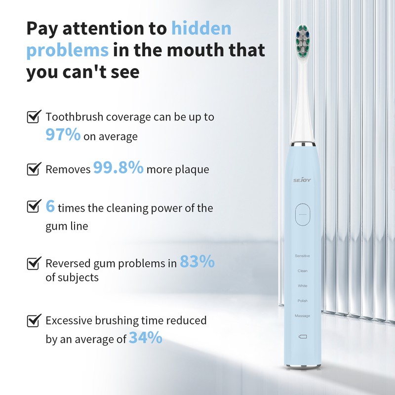 eBay Pa ckage Includes: 1 x Toothbrush Handle 12 x Brush Heads 12x Protective Bristle Cover 1 x USB Charging Cable 1 x User Manual Features: Superior Cleaning Power: The sonic electric toothbrush delivers an impressive 41,000 high-frequency vibrations per minute, providing a deep and thorough clean that is 5 times more effective than low-frequency electric toothbrushes for both adults and kids. Clean up to 5X the plaque and surface stains for a healthier, brighter smile. Teeth Whitening Electric Toothbrush: Advanced whitening technology in an electric toothbrush for adults helps whiten teeth with consistent use, leaving you with a more radiant smile. The built-in 2-minute timer and 30-second reminder function ensure a scientifically recommended brushing time, and the 5 brushing modes offer a tailored cleaning experience that suits your unique oral care needs. 12 Brush Heads for more than 3 Years to Save Money: The rechargeable electric toothbrush comes with 12 premium replacement brush heads, protecting teeth and gums. The Sejoy electric toothbrush for adults is designed to provide 24 months of usage and save you money on buying new electric toothbrushes for adults. 5 Brushing Modes for All Oral Care Needs: This rechargeable electric toothbrush for adults offers 5 different brushing modes, including Soft, Clean, White, Polish, Massage to cater to different cleaning and care needs. You can also turn off the electric toothbrush in any mode by pressing the button for 2 seconds. 120 Days Battery Life & Travel Convenience: This powerful electric toothbrush only requires 4 hours to fully charge and can last up to 120 days of use. The exquisite and portable travel case and holder make this electric toothbrush for adults great for travel and business trips, so you can always maintain good oral hygiene on the go.