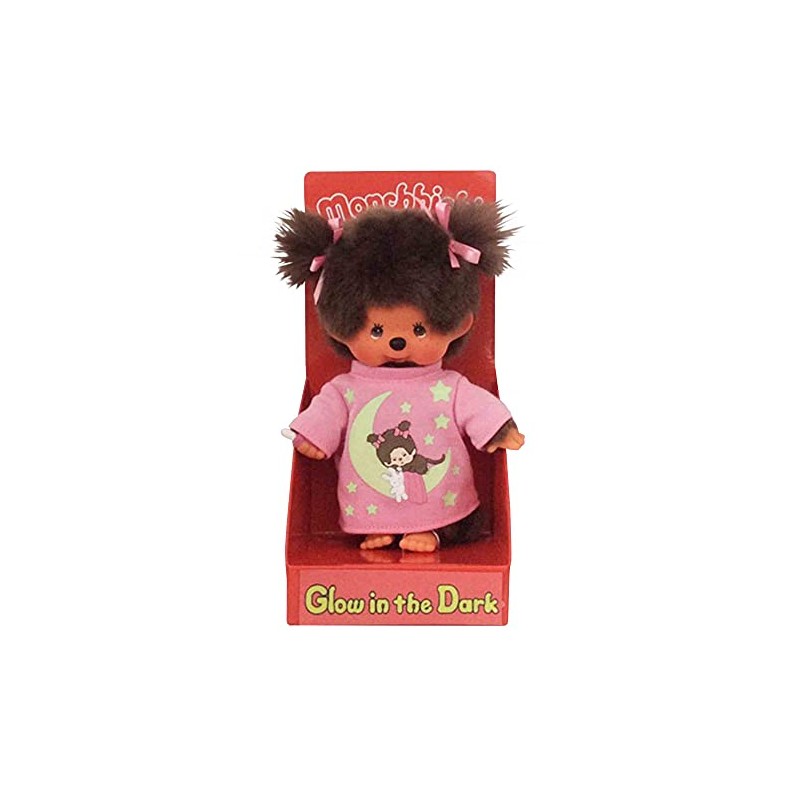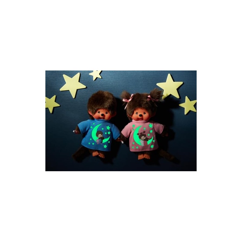 • Cute Monchhichi girl with pink sleep shirt, decorated with moon and stars that glow in the dark, size approx. 20 cm