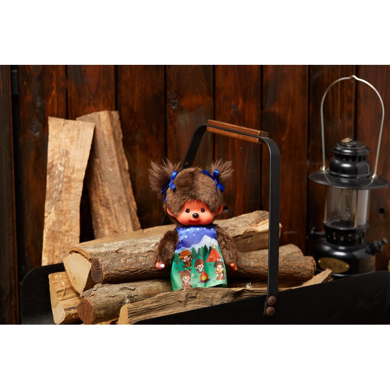 - Cute Monchhichi girl with blue bows in her hair and pretty summer dress with camping motif, size approx. 20 cm