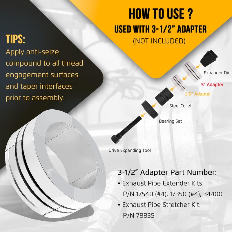• 【Precautions】Precisely manufacted to work with 3-1/2” (3.5") adapter found on some Exhaust Pipe Extender Kit Part Number # 17350, 17540, 34400, 78835.Please make sure that the threads and cone are well lubricated.
