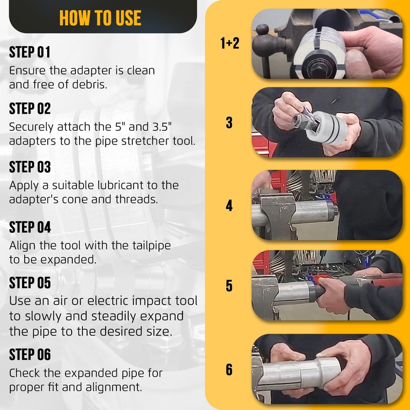 • 【How to Use】Simply attach the 5" adapter to the pipe stretcher, lubricate the cone and threads, align with the exhaust pipe, and use the impact tool to expand the pipe.