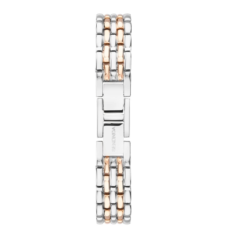 Sekonda Monica Ladies Watch 40555 Sekonda 40555 ladies watch featuring a square cushion shaped case with a white textured dial and roman numeral hour markers. This watch is fitted with a two tone rose tone and silver tone bracelet and has a snap fasten. A classical watch, great for everyday wear.