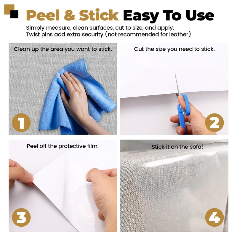 - Peel & Stick: Includes a 118”x12” (3mx30cm) anti cat scratch furniture protector roll and 30 twist pins. Simply measure, clean surfaces, cut to size, and apply. Twist pins add extra security (not recommended for leather)