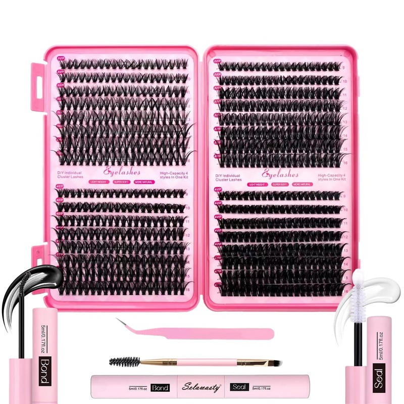 Selawasty DIY Lash Extension Kit 640pcs Individual Lashes Clusters D Curl Eyelash Extensions Kit with Lash Bond and Seal Tweezers Brush Lash Books DIY at Home (9-16mm,30D+40D+50D+60D,KIT)
