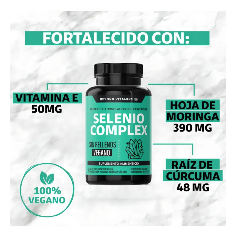 ## Beneficios Clave de Selenio | Seleniometionina 240mcg Beyond Vitamins * 💪 **Apoyo Antioxidante:** Selenio, Vitamina E y Curcuminoides para combatir los radicales libres. * 🌱 **Ingredientes Naturales:** Seleniometionina, Moringa y Cúrcuma de alta calidad. * ✅ **Calidad Garantizada:** Libre de GMOs, azúcares, edulcorantes, colorantes y saborizantes artificiales. Pruebas y certificados disponibles. * 🌿 **Vegano y Puro:** Formulado sin ingredientes de origen animal, lácteos, soya, hormonas ni antibióticos. * 💊 **Fácil de Usar:** 180 cápsulas para un suministro duradero. * 🔬 **Formulado por Científicos:** Confía en la ciencia para tu bienestar. * 🛡️ **Fabricado con GMP:** Proceso de fabricación con estrictos controles de calidad.