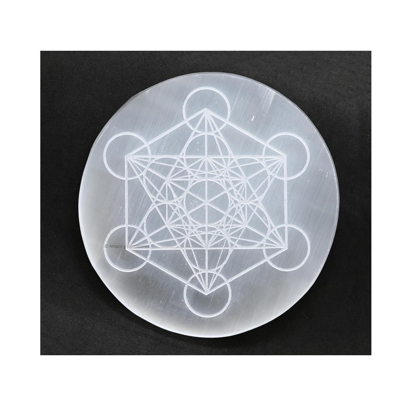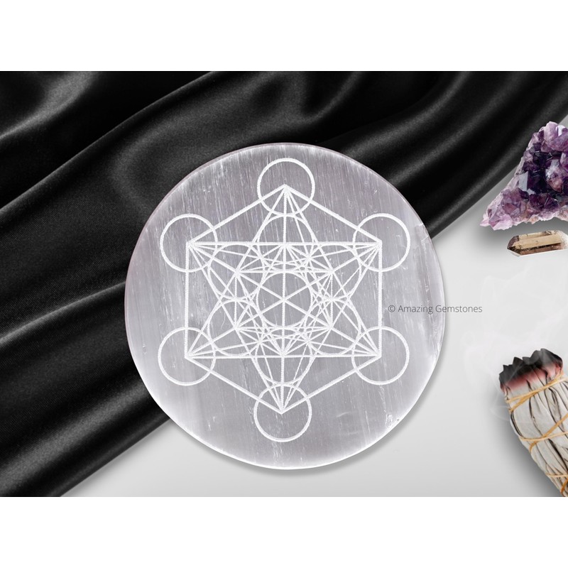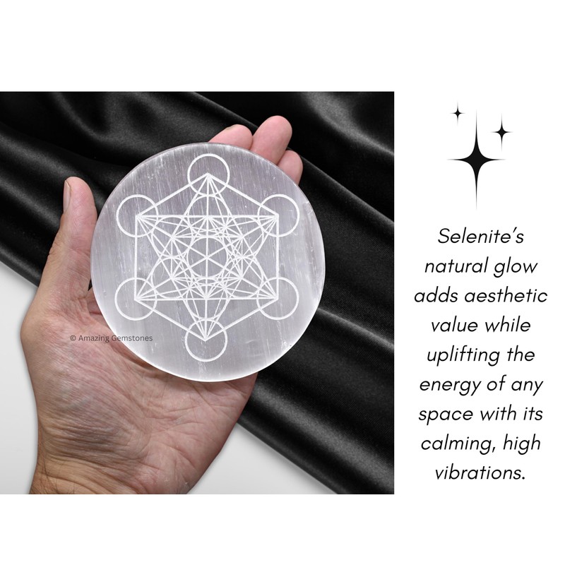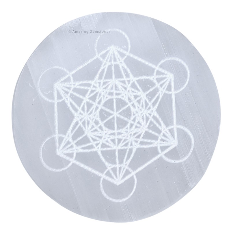 Selenite Crystal Charging Plate For Crystals And Healing Stones, 3" Selenite Crystal Plate Engraved Metatron Coaster For Home Office Table Decor (Selenite Round Disc)