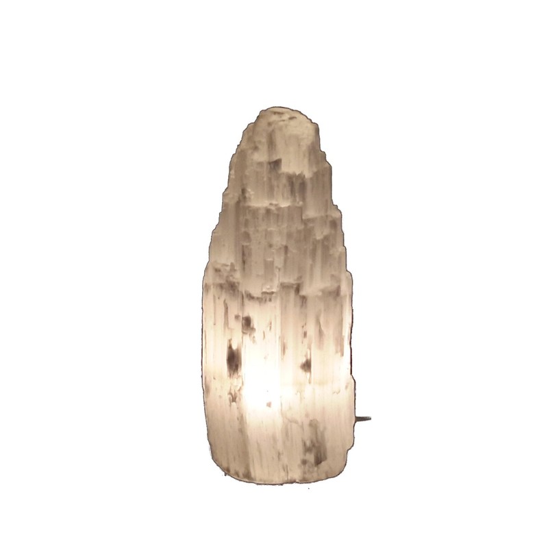 These beautiful Selenite Lamps are made of rough chunks of clear selenite crystal towers and fashioned to handle a standard night light bulb and cord. Blue Calcite is a type of mineral which exhibits a pale blue or green hue. Bulb and cord included.