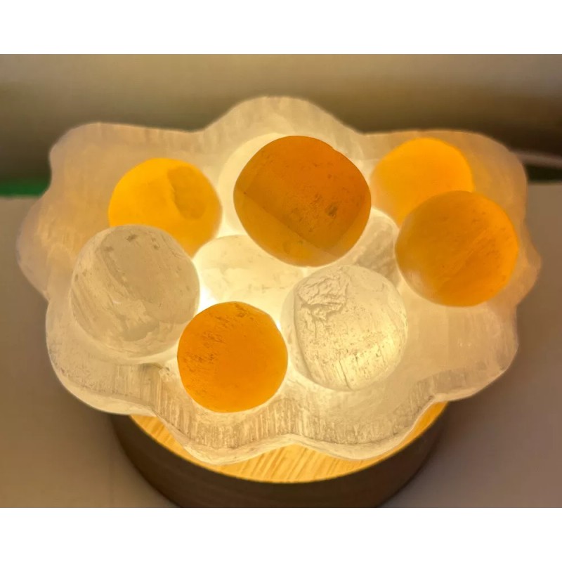 This beautiful lamp features a unique design that incorporates a seashell, pearls, and selenite crystals. The soft glow of the light shining through the crystals creates a calming and serene ambiance in any room. The seashell and pearls add a touch of coastal charm to the overall aesthetic. It is a stunning piece that would make a lovely addition to any collection or home decor.