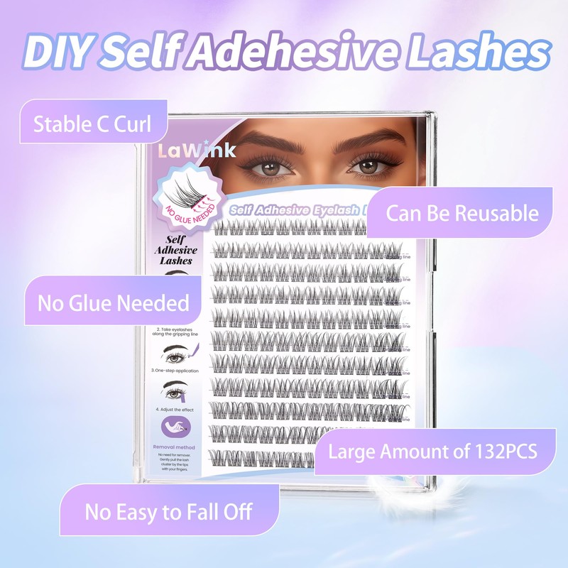 - Pre-Glued Eyelash Clusters for Effortless Application:LAWINK self-adhesive eyelash clusters eliminate the need for messy lash glue. Each cluster comes pre-glued with a transparent adhesive strip, allowing for quick and clean application. Simply press the lash clusters underneath your natural lashes for an instant, seamless extension look