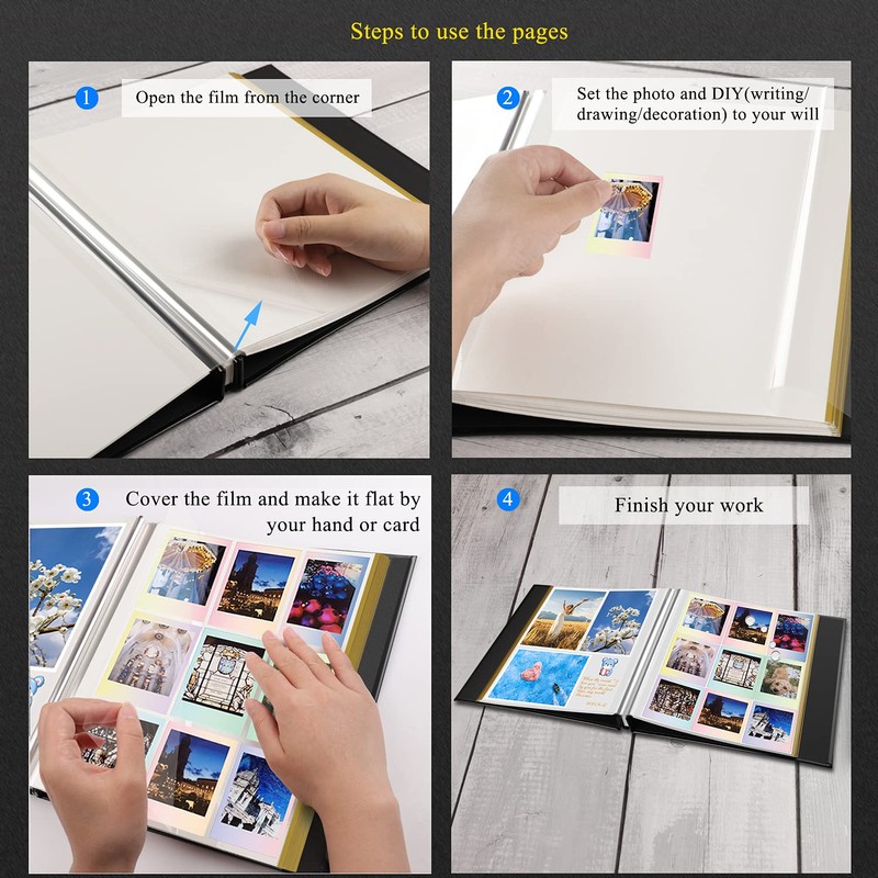 - 【GOOD ADHESION AND LONG-TERM PRESERVATION】The thickened and clear film and high quality inner sticky pages can protect photos and text well from dust, debris, and moisture. Lignin-free, acid free and PVC free. It will not fade for years, which is suitable for long term storage. No corner stickers or glue needed to place photos on the page. The adhesive is strong enough to hold the photos, but you can still reposition or remove them as needed.