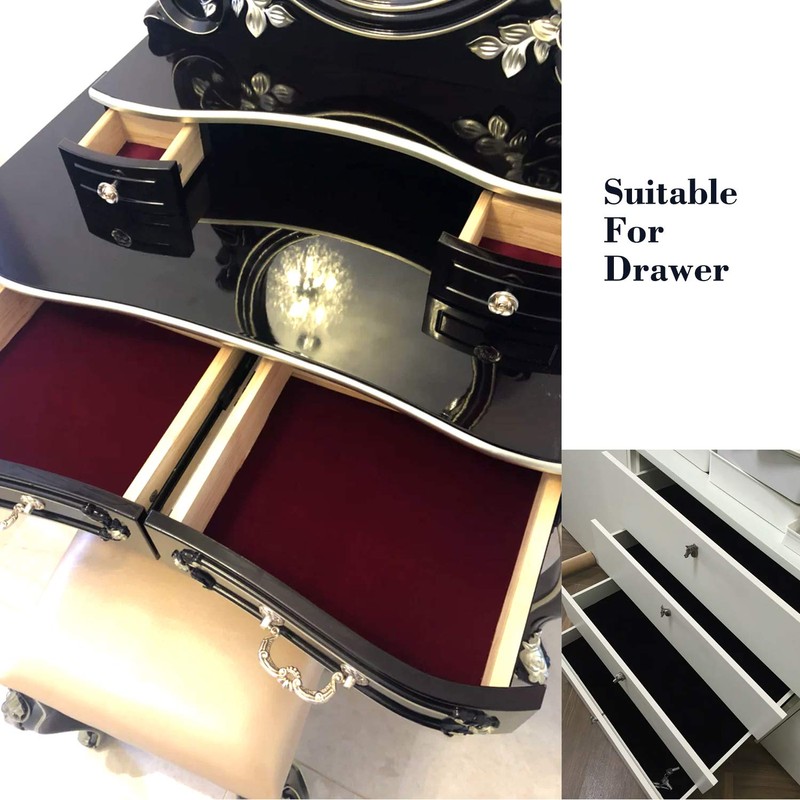 - This self adhesive velvet flocking Liner wildly application for backdrop or liner.Such as display cabinet, drawer liner, jewelry box, antique furniture decoration etc.