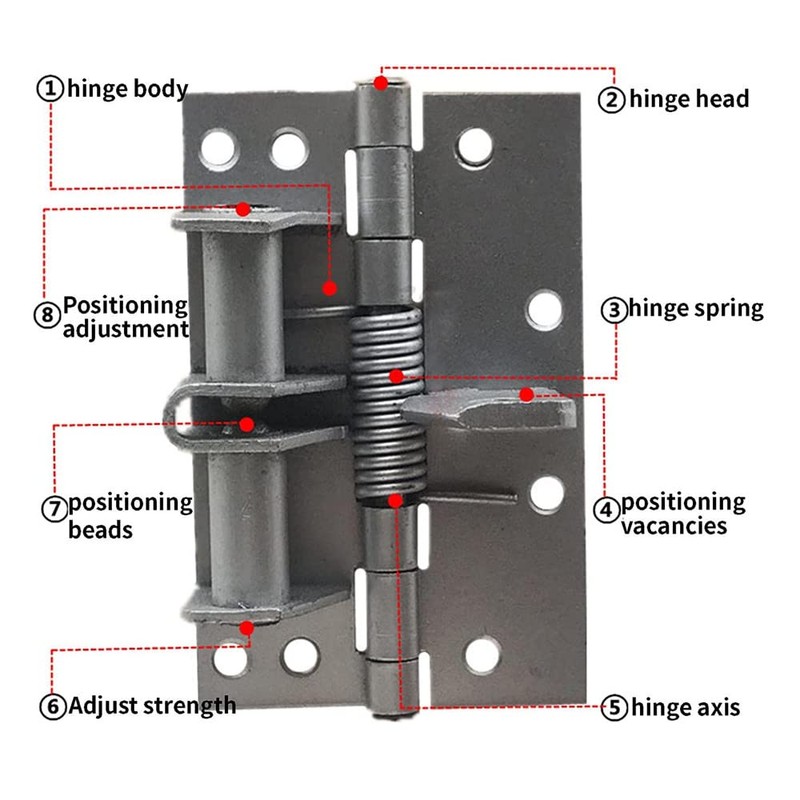 - Material: made of iron. It is a multifunctional hinge that integrates door closer, door stopper and floor spring.