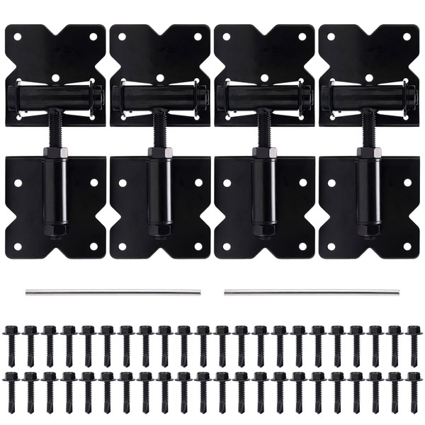 Self Closing Gate Hinges, Heavy Duty Hardware for Outdoor Vinyl/Woodn Fence Gates, 90 Degree Adjustable Gate Hinges Kit, Black Self Closing Hardware with Screw Kits and Swing Adjuster Tool, 4 Pack
