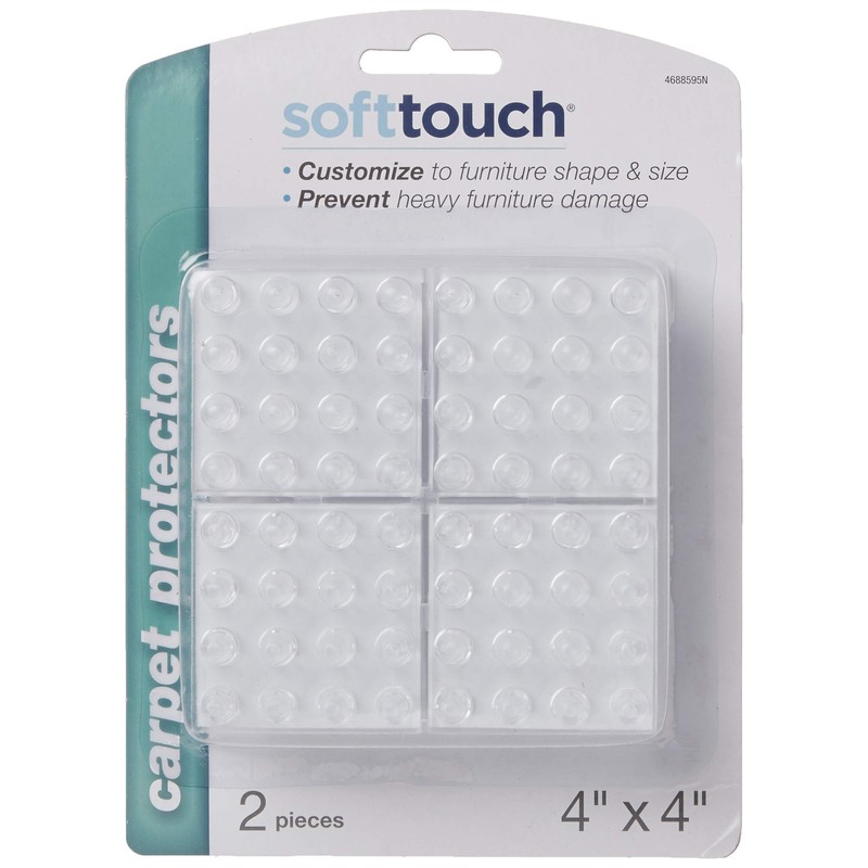 Protect carpeted surfaces in your home with SoftTouch anti-dent furniture pads. The 5/8" spiked bottom prevents denting of deep pile carpet beneath furniture legs without damaging the backing of the carpet and stops the furniture piece from shifting with every day use. The pads are easy to install with their self-adhesive design; just peel and stick to apply to furniture leg. Use on tables, sofas, chairs, curio cabinets, desks and much more. Each pack includes (2) 4" square pads that easily snap into (8) 2" squares for smaller furniture use.From the Manufacturer