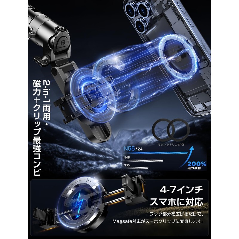 - Innovative design. 2-in-1 Double Use, Magnetic Strength + Clip: The strongest combination of 24 x N55 Super Strong Magnetic Magnets: We researched the use of various selfie sticks, and finally fused magsafe with the clip. This selfie stick magnet has been redesigned to be a ring shape and adopt a unique strong magnetic force layouts... an upgrade from the 12 old N55 magnets to 24 N55 magnets! The suction power has been improved to 200 times more than others, so it can be compatible with iPhone 12/13 series and later versions and Magsafe cases. When your smartphone approaches this magsafe selfie stick, it will instantly attract in just 1 second. It absorbs firmly and does not fall off even if you shake it, so you won't miss any wonderful moment. For smartphones and cases that do not have magnetic functionality, 2 magnetic rings are included