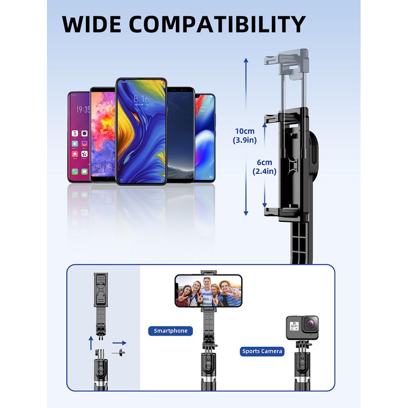 - WIDELY COMPATIBLE: Selfie stick phone holder that can be adjusted to a width of 2.5-3.7" (6.5-9.5 cm), making phone stand compatible with most smartphones. Such as iPhone 16/15/14/13/13 pro/12/12 mini/12 pro/12 pro max/11/11 pro/xr/x/8/8 plus/7/7 plus/6/6 plus/galaxy note 20/s20/note 10/s10/note 9/s9/s8/gopro/oneplus/android smartphone, the ideal companion for any mobile photographer, make each of your photos creative. It great for selfies, group photos, life-vlog, video shooting, social life