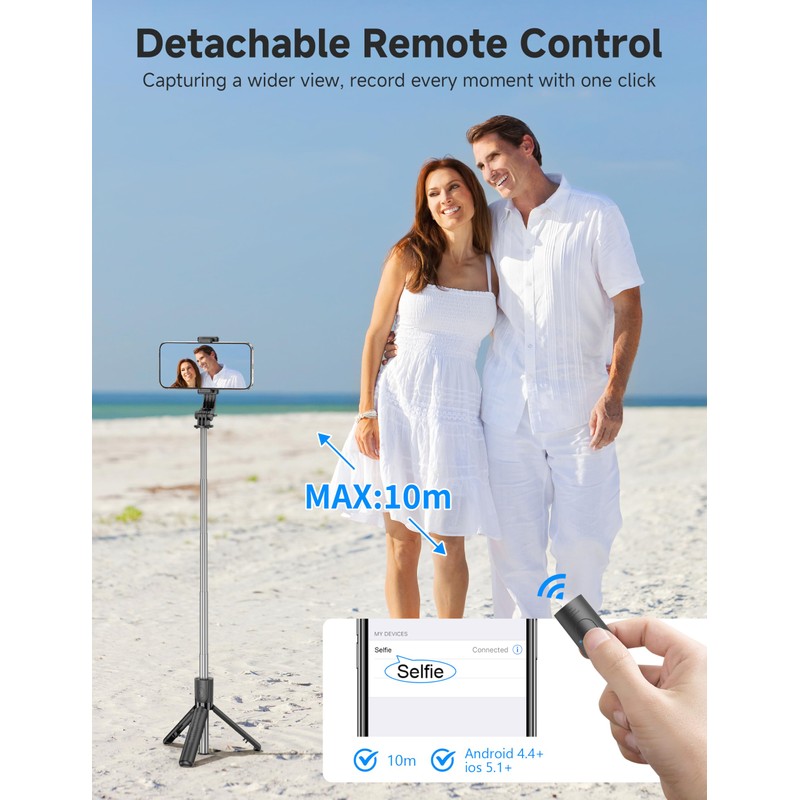 • DETACHABLE REMOTE CONTROL: Wireless remote with detachable design, can be placed on the remote notch of your cell phone tripod to prevent loss, supports shooting within 30 ft (10m), compatible with ios/android, it's as simple as holding the remote button down for a few seconds and the selfie stick appears and is ready to connect and once connected and open the phone camera app to use it to take a selfie. Freeing your hands to capture the most beautiful you