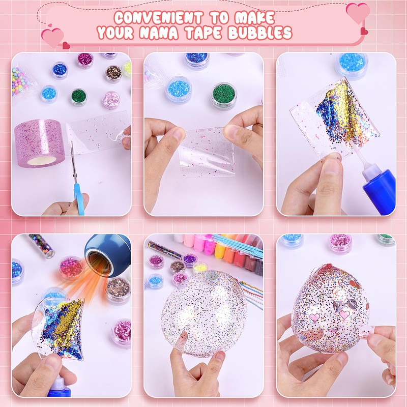 - 【Nano Tape Elastic Bubble Set】- This set contains 5 rolls of transparent or glittering nano tape, 12 varieties of colored sequins, 12 colors of clay, 16 sheets of stickers, and 10 pieces of straws. Additionally, it includes three boxes of sugar granules, three bags of pentagrams, one bag of colorful pearl particles and chains, an air pump, and tools like tweezers and scissors for bubble blowing. This comprehensive kit is perfect for creating fascinating nano tape soap bubble toys with family and friends, ensuring ample supplies for a fun-filled experience.