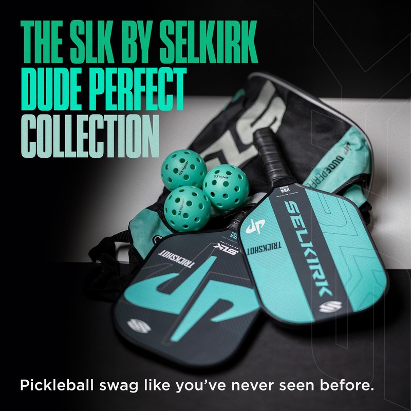 The SLK x Dude Perfect Trickshot Bundle combines everything you need to start playing Pickleball! 1 SLK x Dude Perfect Sling Bag, 2 SLK x Dude Perfect Trickshot paddles, and 3 SLK x Dude Perfect Hybrid Picklballs.