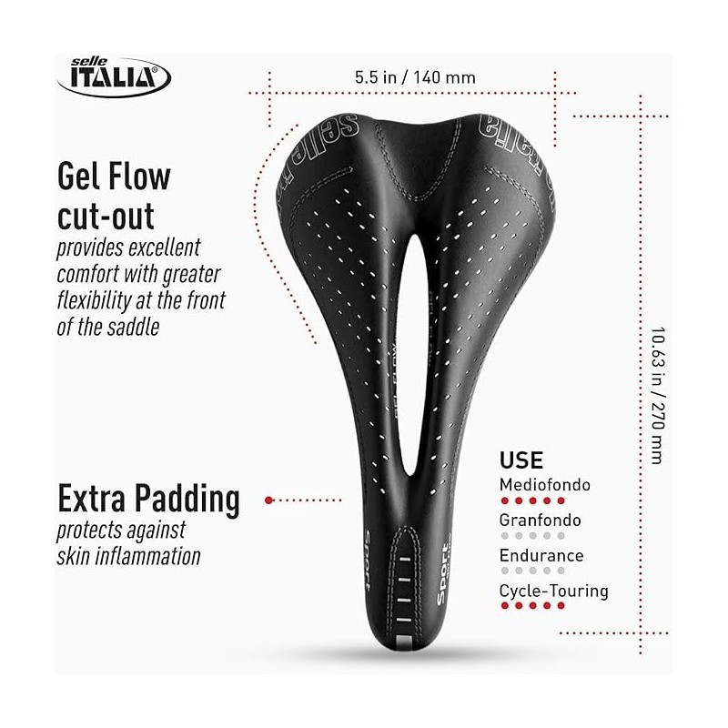 Selle Italia Sport Gel Flow Road Bike Saddle - Comfortable MTB and Road Bicycle Seat for Men and Women , Black, 270 x 140mm