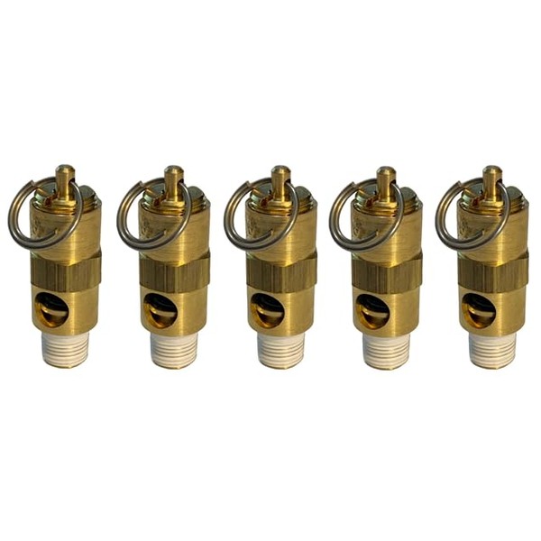 Sellerocity American Made ASME Code 5-Pack of Brass Air Compressor Safety Valves Featuring Stainless Steel Spring & Silicone Seal, 1/8 NPT, 70 PSI, 37 CFM