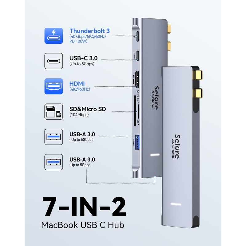 Selore&S-Global USB C Adapter HDMI Hub for MacBook Pro/Air M1 M2 M3 2024 2023 13" 15" 16",Mac USB Adapter 7-in-2, MacBook Accessories with HDMI,Thunderbolt 3, USB C and 2 USB A 3.0 Data Ports, SDµSD Card Reader