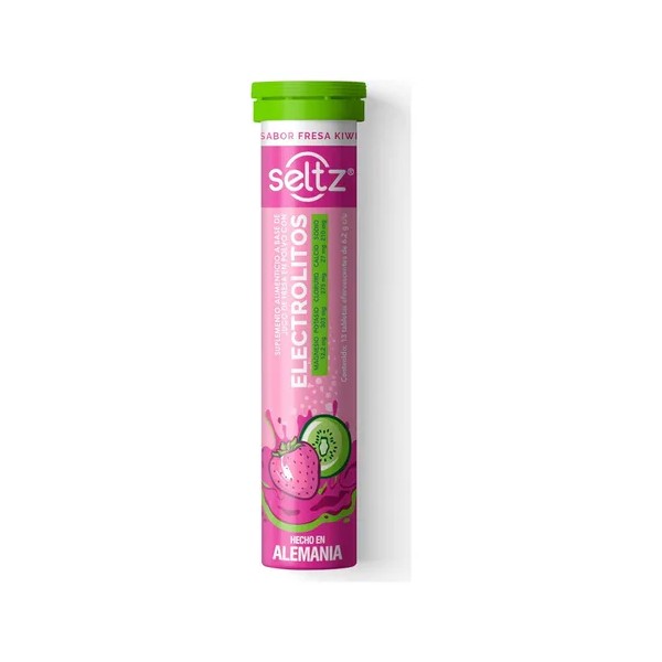 Seltz Electrolitos es un suplemento diseñado para reponer rápidamente los electrolitos perdidos durante la actividad física intensa, la deshidratación, o episodios de diarrea. Las tabletas efervescentes de Seltz son fáciles de disolver en agua y tienen un agradable sabor a fresa-kiwi, lo que facilita su consumo.