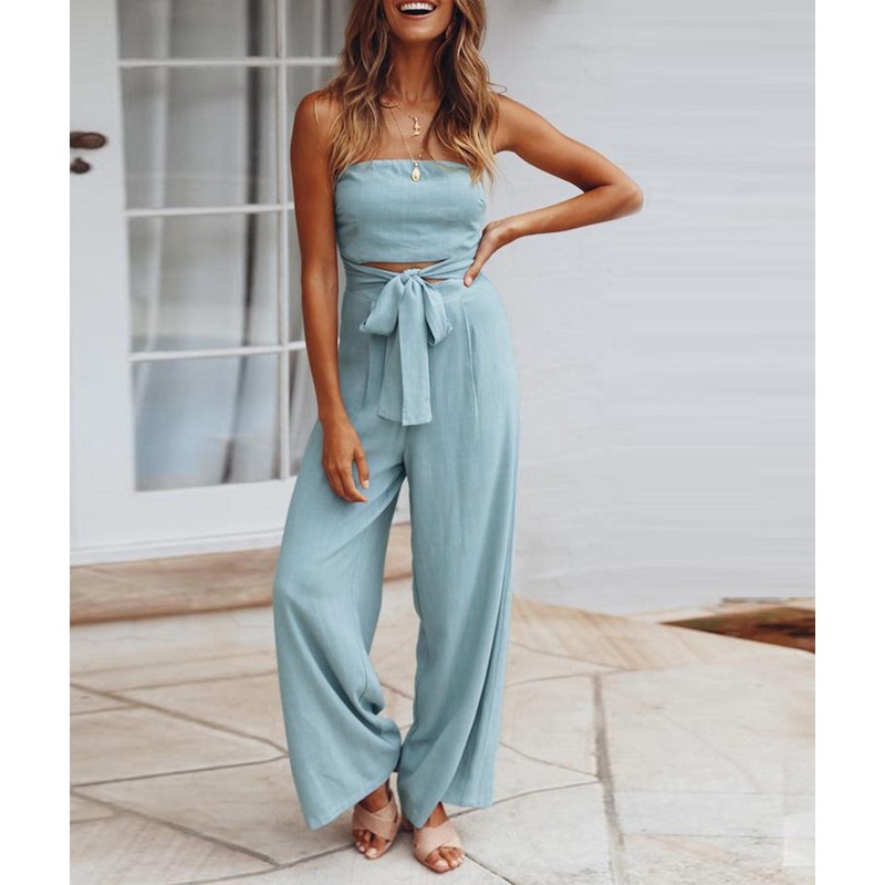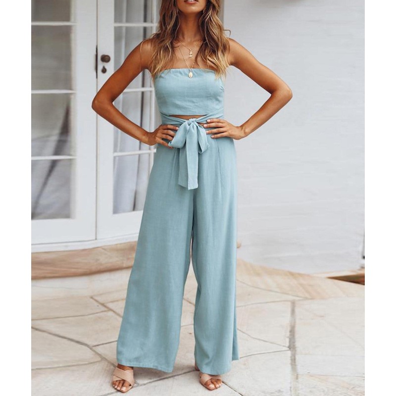 SEMATOMALA Mameluco largo de pierna ancha para mujer, sin tirantes, hombros descubiertos, recortado, cintura con nudo y cinturón, Azul claro, S