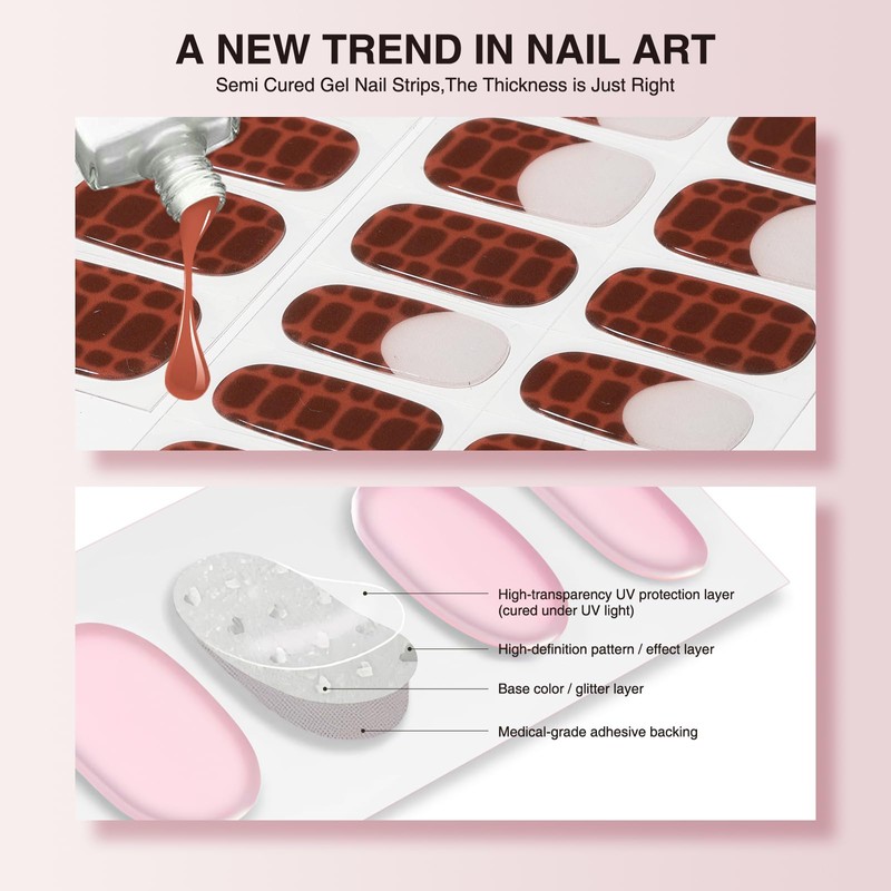 - SAFE & HEALTHYT:The semi cured gel nail strips do not contain poisonous or hazardous materials. It makes use of odorless, non-toxic ink, premium polymer gel, and non-irritating glue. The glue on the reverse of the gel nail strips is adhesive, won't easily peel off, and won't harm your nails, so you may use it without risk.