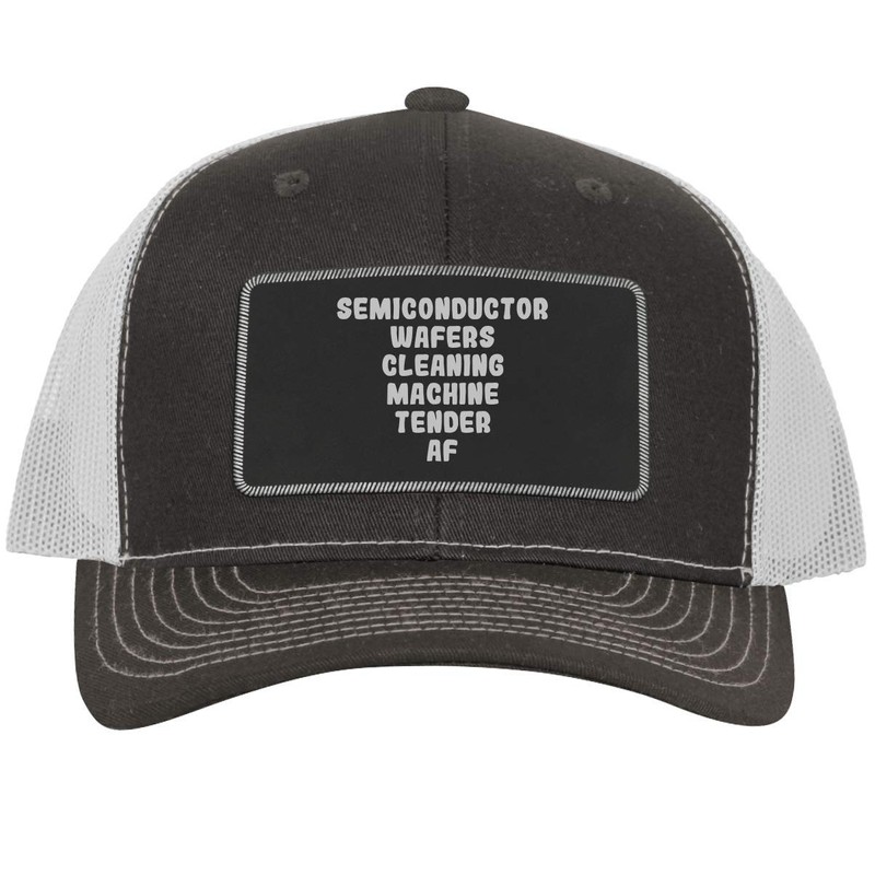 Semiconductor Wafers Cleaning Machine Tender AF - Leather Black Patch Engraved Trucker Hat, Grey-White, One Size