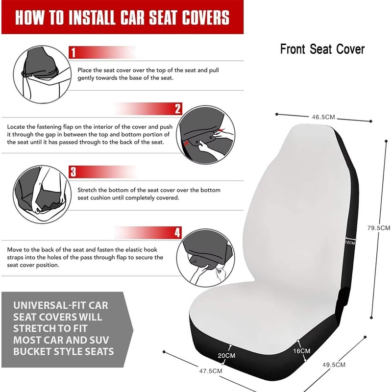 Material: car seat covers are made from polyester fabric which is soft, breathable and durable, wear-resistant and dirt-resistant,all seasons.They stretch easily to provide full coverage and protection.