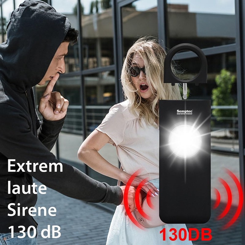 Deters and draws attention to attackers: Thanks to its extremely loud 130 dB siren, you can trigger an emergency deafening alarm. How to drive away attackers. Or draw attention after an accident if you can no longer make yourself noticeable. At the same time, a bright flashing light attracts further attention to you. Ideal for women, children and the elderly.