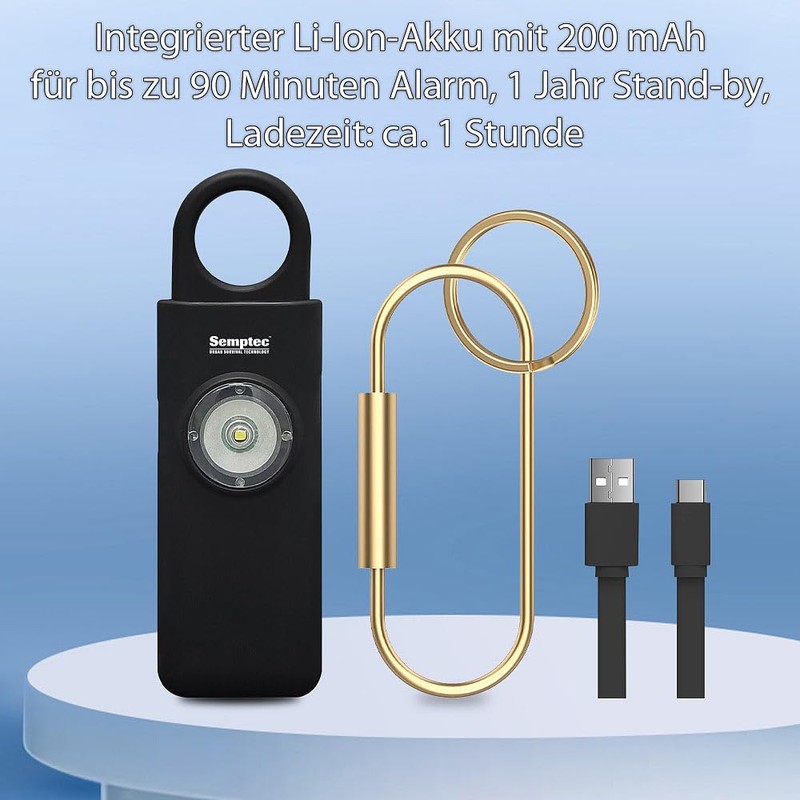 - Alarm system for on the go: ideal for women and children Extremely loud siren: 130 dB Integrated LED torch for visibility in dark alleys and house entrances Quick and easy to use: simply pull out pin to trigger alarm Built-in 200 mAh battery for up to 90 minutes of alarm and 1 year stand-by Charges via USB-C (USB charging cable. USB-C to USB-C to USB-A included