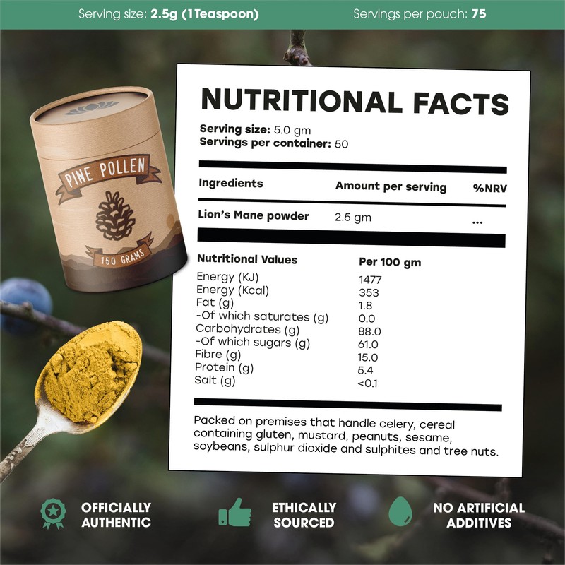 - ? Natural Energy: Boost your energy and vigour with our nutrient-rich pine pollen powder, supporting vitality and increasing stamina.