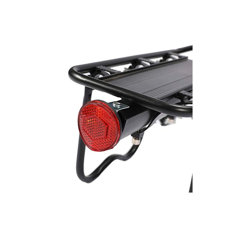- The bicycle luggage rack is equipped with red rear reflectors, which can make your riding at night safer. With a side protection frame to protect your luggage from scratches by wheels or spokes
