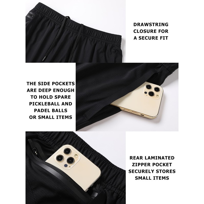 - Almacenamiento seguro con bolsillos con cierre: los pantalones cortos cuentan con bolsillos laterales profundos para guardar de forma segura las pelotas de pepinillo adicionales durante los partidos, mientras que el bolsillo trasero con una cierre impermeable es ideal para mantener seguros artículos pequeños como llaves o tarjetas