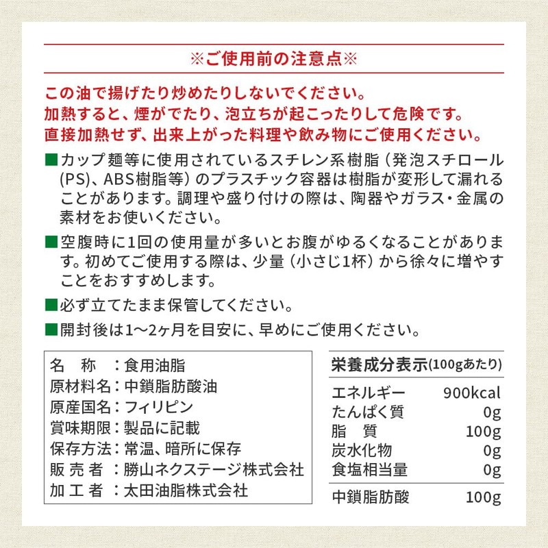 - High quality MCT oil made by a well-established company that has been aiming for over 300 years. Natural formula that does not use any chemical solvents. Carefully extracted at an international standard ISO 9001. Filled in a domestic factory