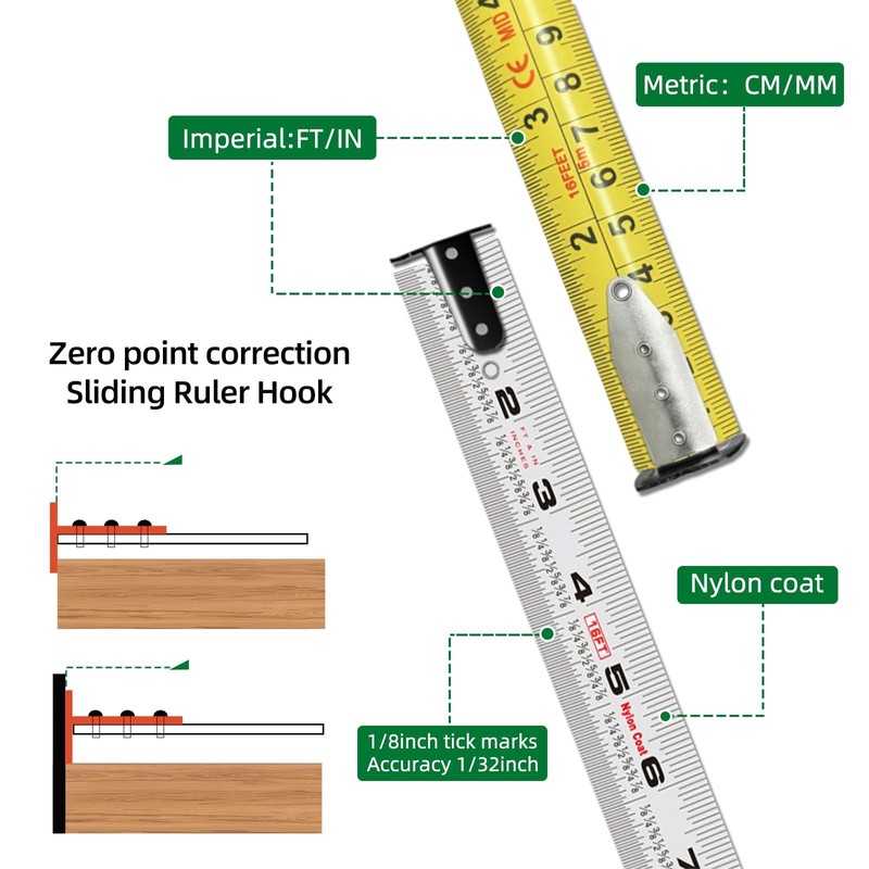 - 【High-Accuracy Measurements】With 1/32 inch double-sided precise marking for easy reading in any direction. The black electroplated hook grips edges securely.