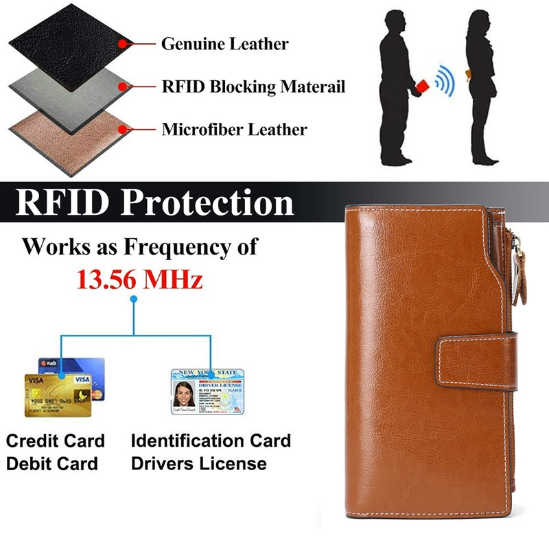- RFID Blocking -- The women leather wallets are equipped with advanced RFID SECURE Technology, a unique built-in metal composite, engineered specifically to block 13.56 MHz or higher RFID signals and protect your private digital information stored in RFID chips from thefts.
