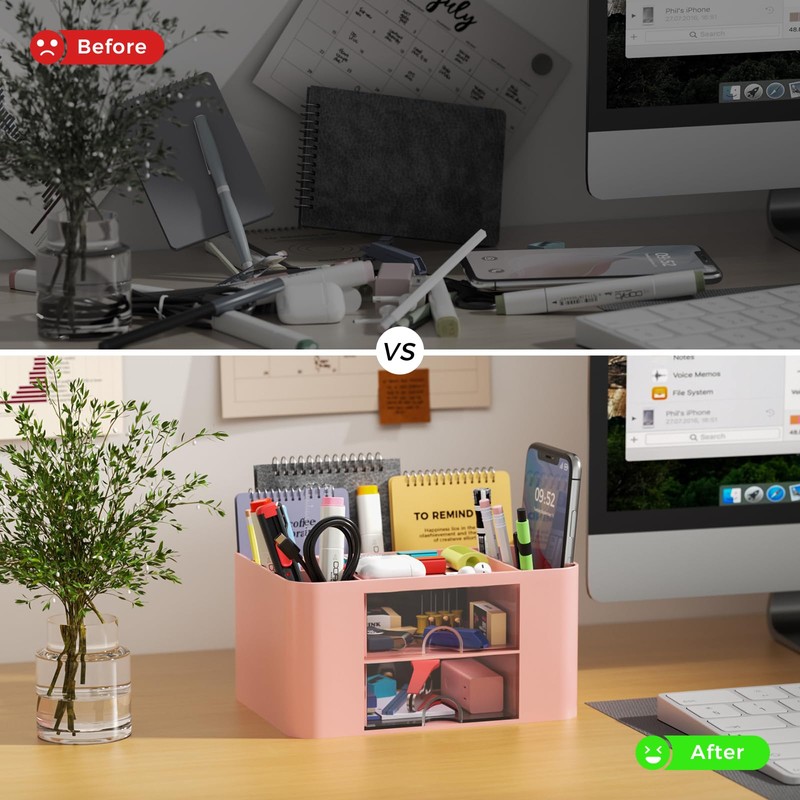 - 【Ample Storage Space】: Equipped with multiple compartments and two drawers, this organizer provides ample storage space for pens, pencils, sticky notes, paper clips, and other small items, keeping everything neatly in place.