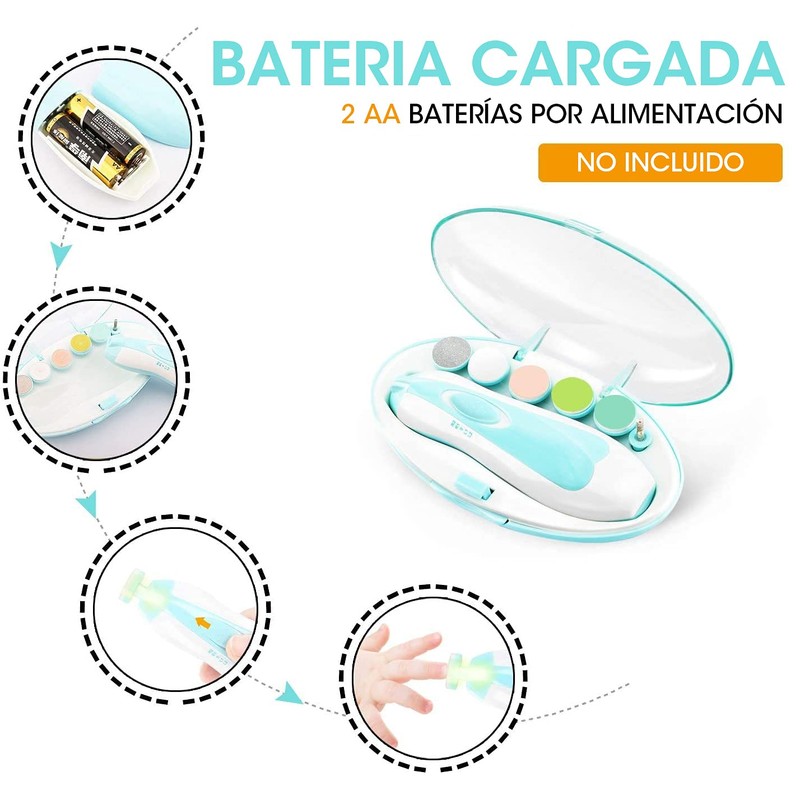 - 👼 【Seguro & Eficaz】El kit de recortador eléctrico de uñas para bebés está fabricado con material ABS no tóxico de calidad que lo hace resistente, duradero y adecuado para bebés recién nacidos de 0 años en adelante. Esta lima de uñas eléctrica para bebés funciona con 2 AA pilas (no incluidas) y con 4 velocidades ajustables, lo que es muy suave con las uñas del bebé, más seguro para recortar y pulir las yemas de los dedos de las manos y los pies del bebé rápidamente, no dañará las cutículas.