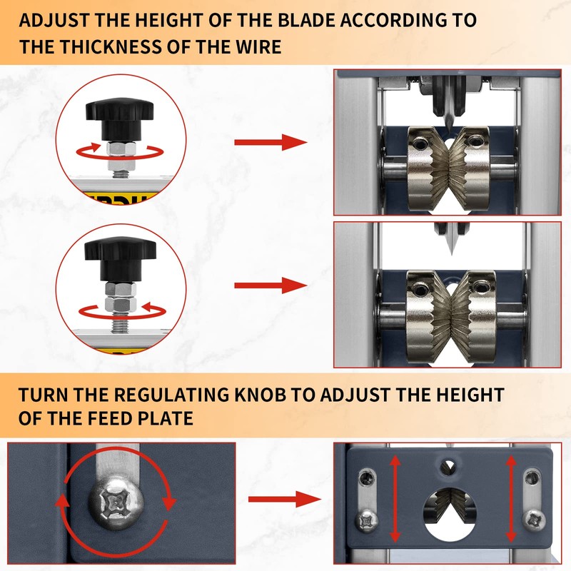 - GREATER COMPATIBILITY: ①Our wire stripping tool has two different sized feeding holes, allowing wires in diameter 0.04"-0.79" (1mm~20mm).Meet your needs for wire stripping diameter sizes, which saves you time, effort and money. ②The position of the feed hole plate can be adjusted according to the wire diameter. ③Adjust the height of the blade according to the Thickness of the wire